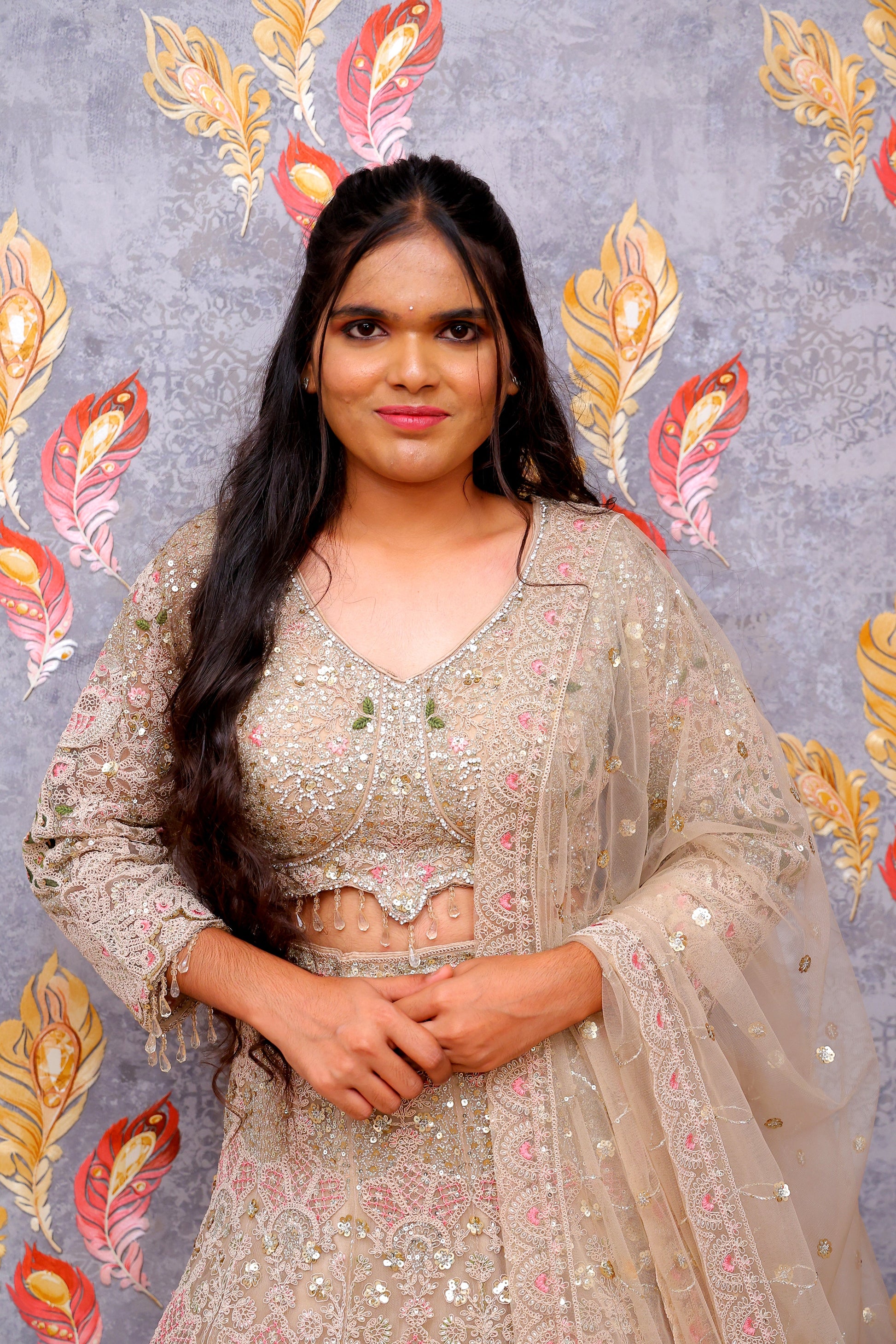 The lehenga features intricate all-over embroidery with delicate floral and geometric motifs, enriched with subtle shimmer that catches the light beautifully. Paired with a finely embroidered blouse featuring a flattering neckline and full sleeves, the ensemble strikes a perfect balance between tradition and contemporary elegance. Completing the look is a soft net dupatta adorned with minimal embellishments, adding a layer of ethereal charm.