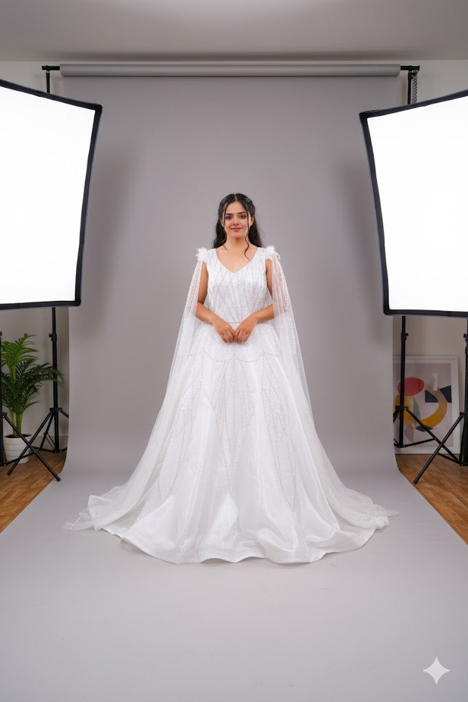 Step into pure elegance with this stunning white designer satin gown from Aira Fabrics Designer Studio, crafted for women who love royal silhouettes and graceful detailing. This gown features a luxurious satin flare that flows beautifully, creating a grand princess-like look perfect for receptions, engagements, cocktail parties, and pre-wedding shoots.
