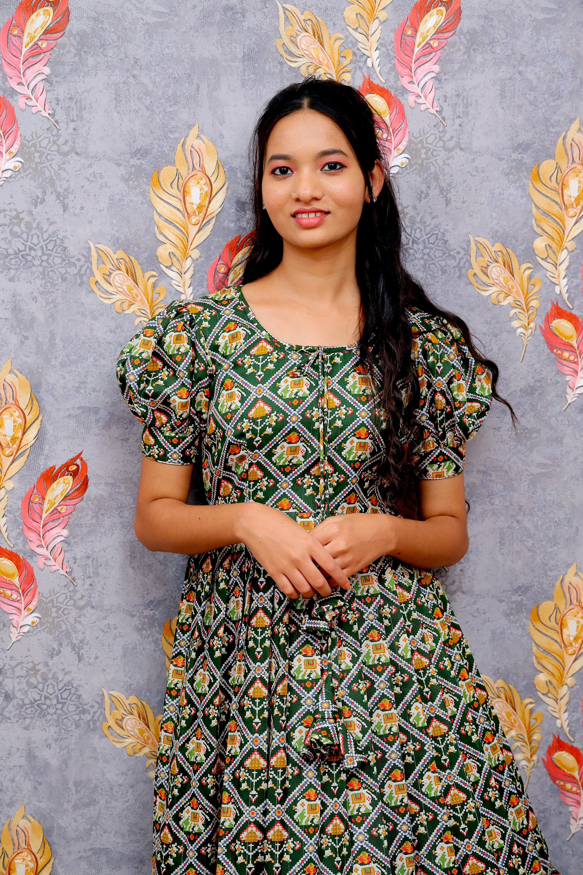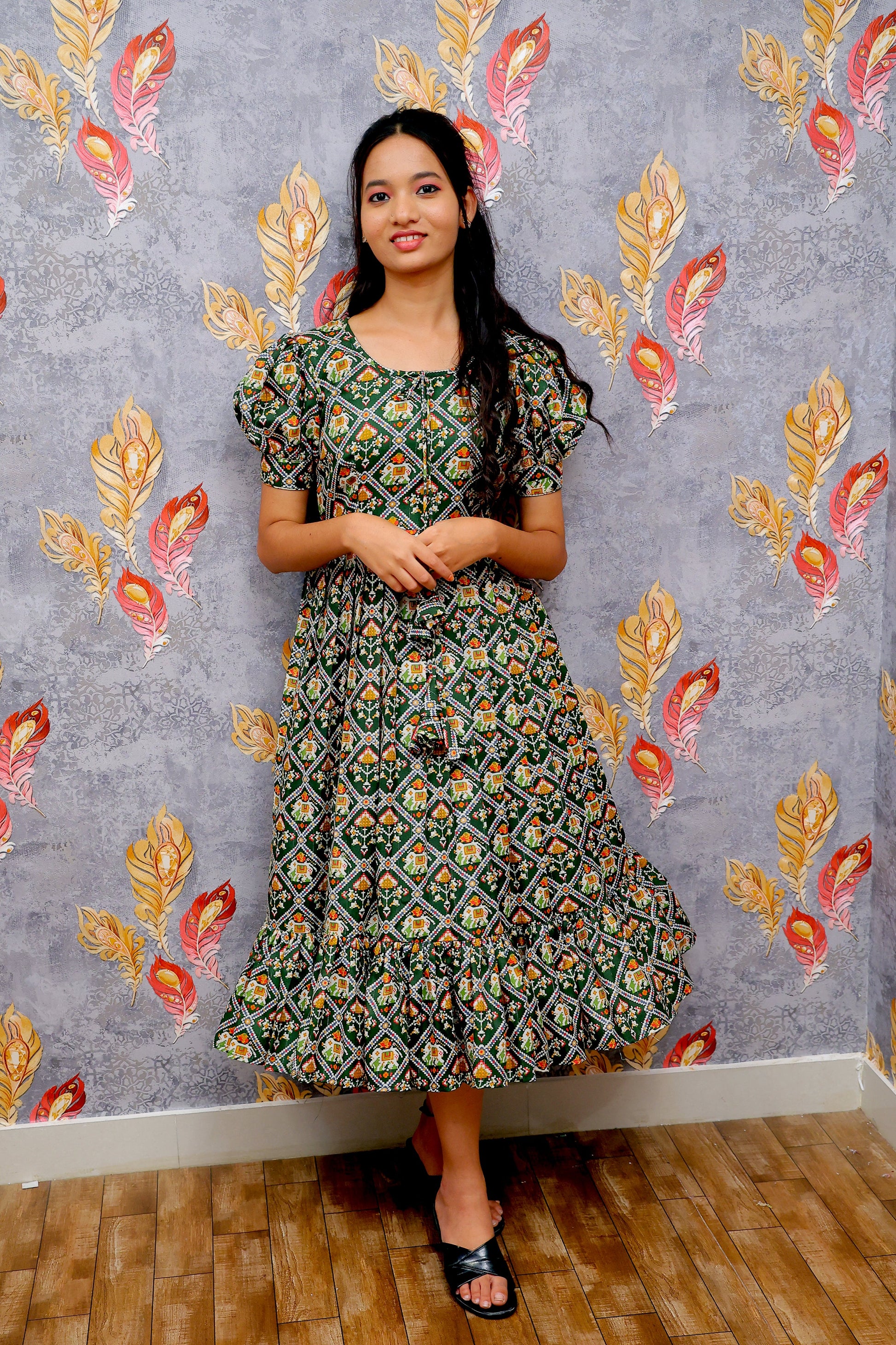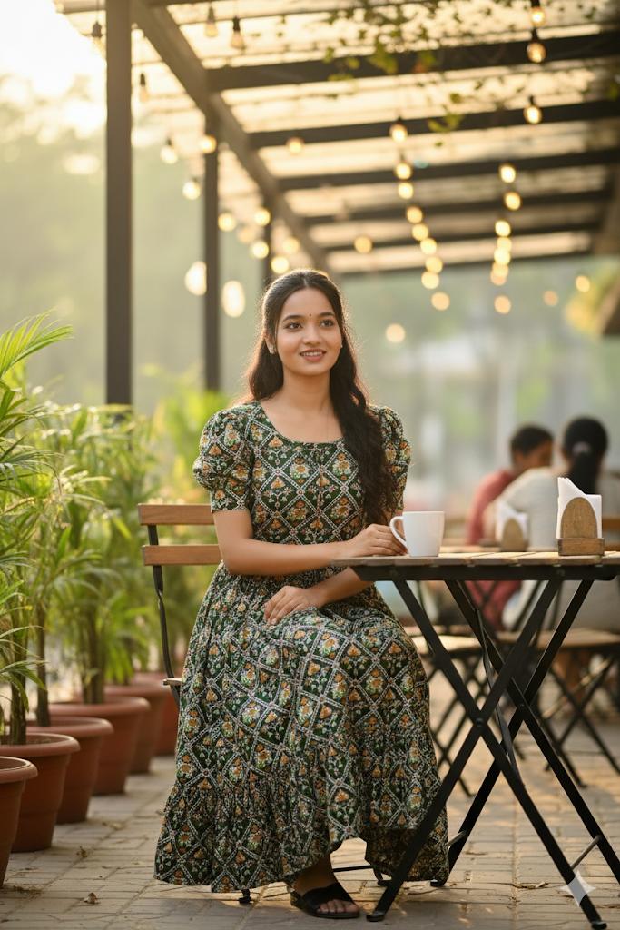 Crafted in a rich emerald green base, this dress features an all-over geometric floral print that adds depth and visual rhythm. The softly gathered waist creates a flattering silhouette, while the puff sleeves lend a touch of playful femininity. Finished with a flowy hemline, this midi dress moves beautifully with every step, making it a perfect choice for relaxed outings and stylish daywear.