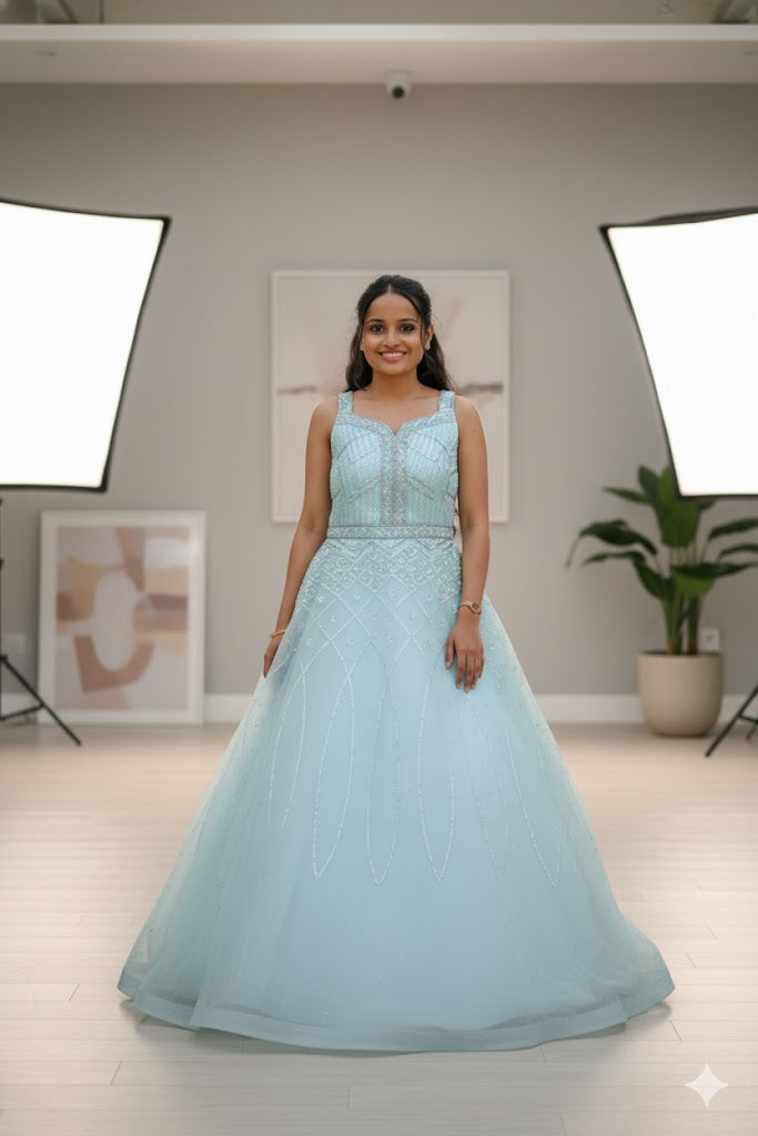 Step into a fairytale with this enchanting mint blue net gown, designed to make every moment feel special. The beautifully embellished bodice features delicate beadwork and shimmer detailing that adds a soft sparkle, while the flowing net skirt creates a graceful, dreamy silhouette. Its sleeveless design and fitted waist enhance elegance while ensuring comfort throughout the day or evening.