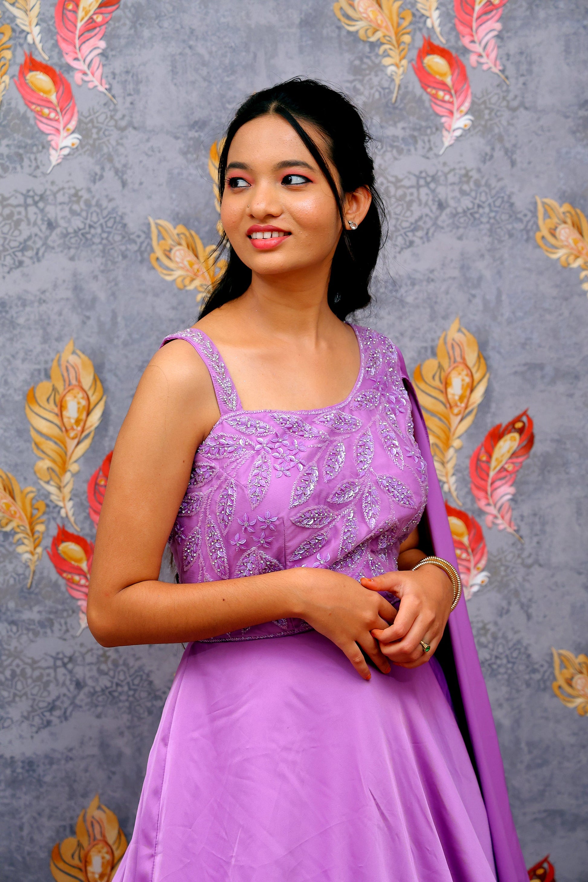 The soft lavender hue adds a dreamy charm, while the intricate embroidery enhances the richness of the design, making it perfect for festive occasions, evening gatherings, celebrations, and special events. Crafted with premium fabric, this gown offers both comfort and a luxurious drape, ensuring you look effortlessly elegant with every step.