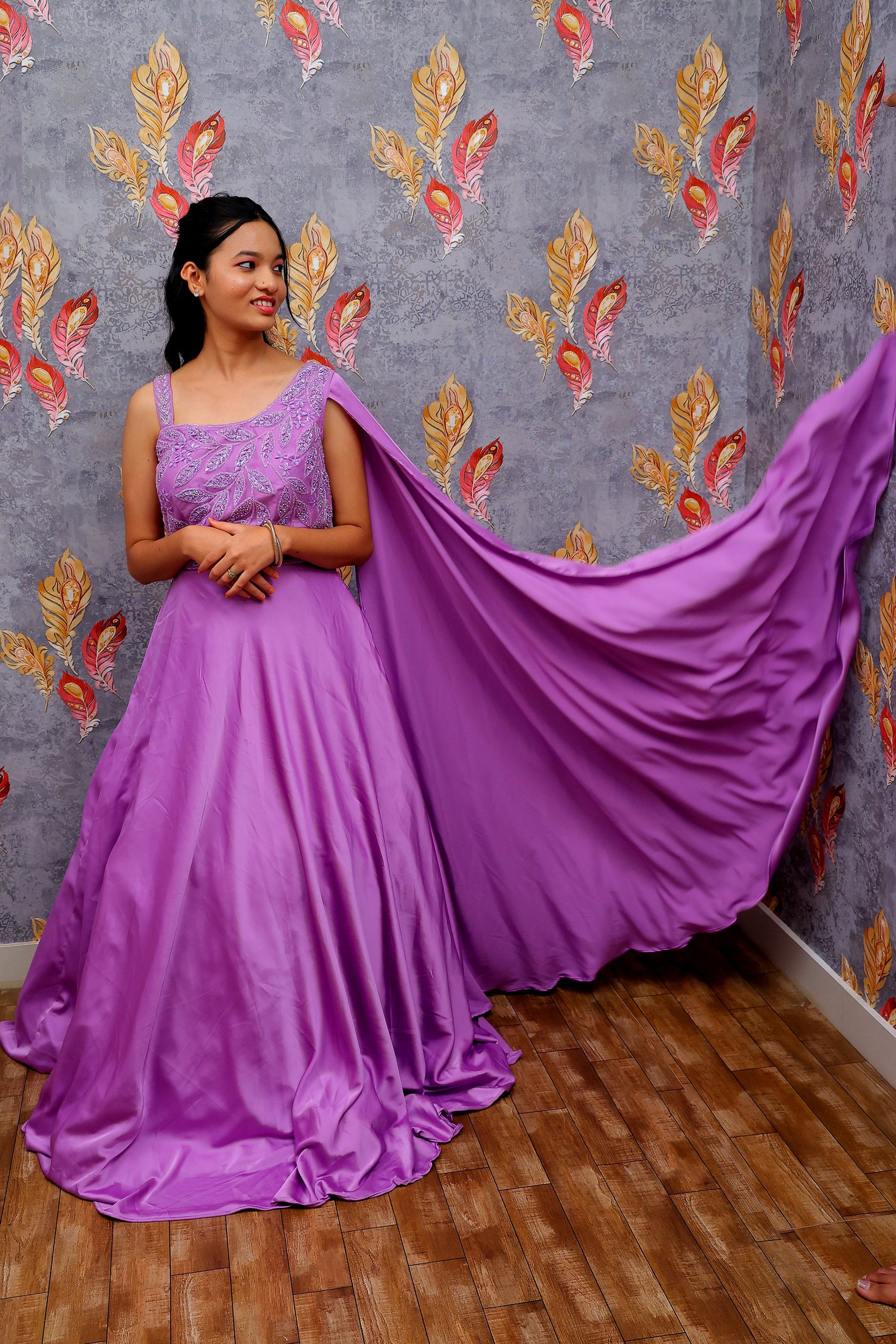 Step into statement elegance with this exquisitely designed Lavender Embroidered Designer Gown from Aira Fabrics Designer Studio. Created for women who love refined glamour with graceful movement, this gown features a beautifully embroidered bodice paired with a fluid, flared silhouette and a dramatic flowing dupatta.