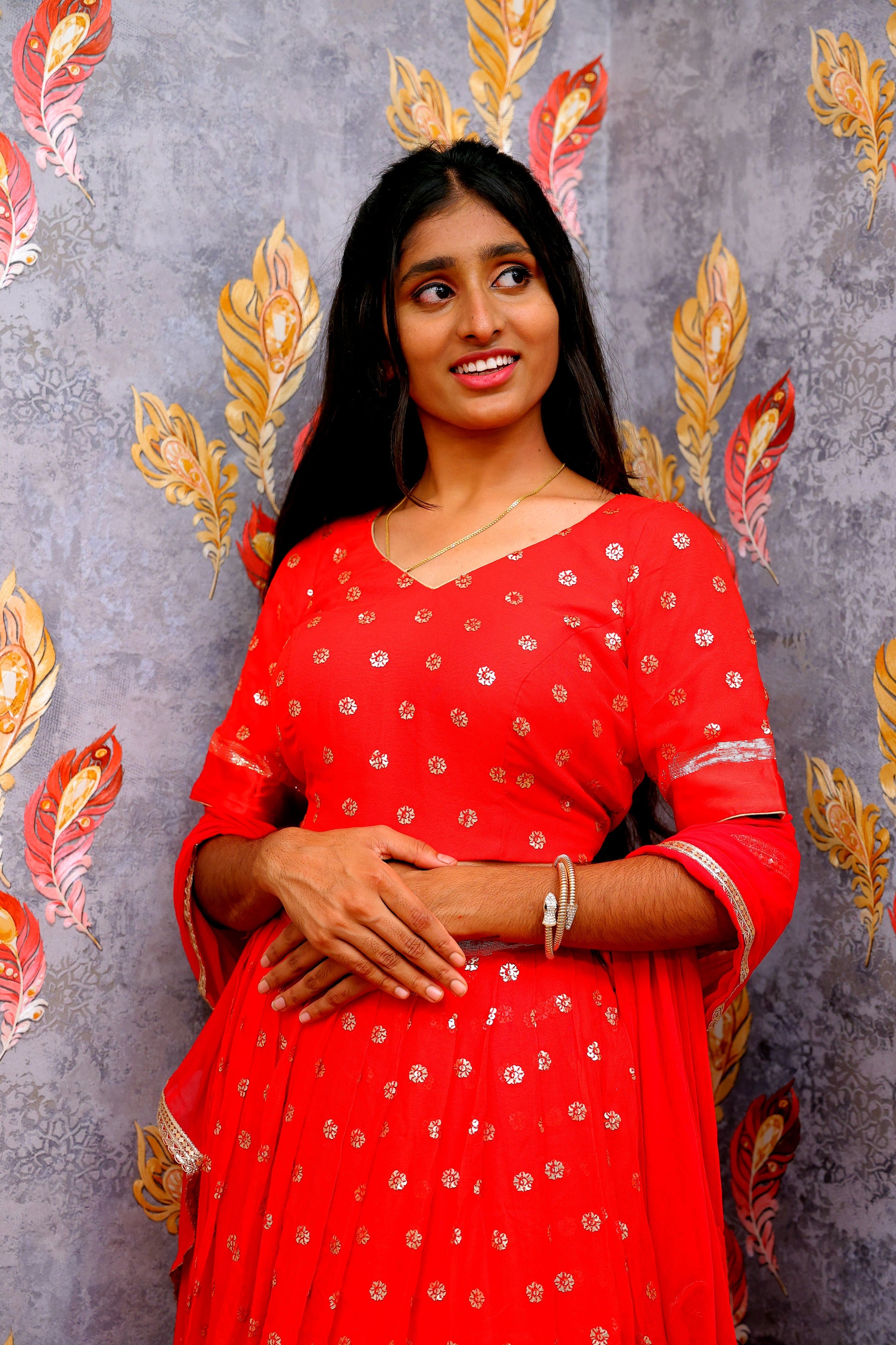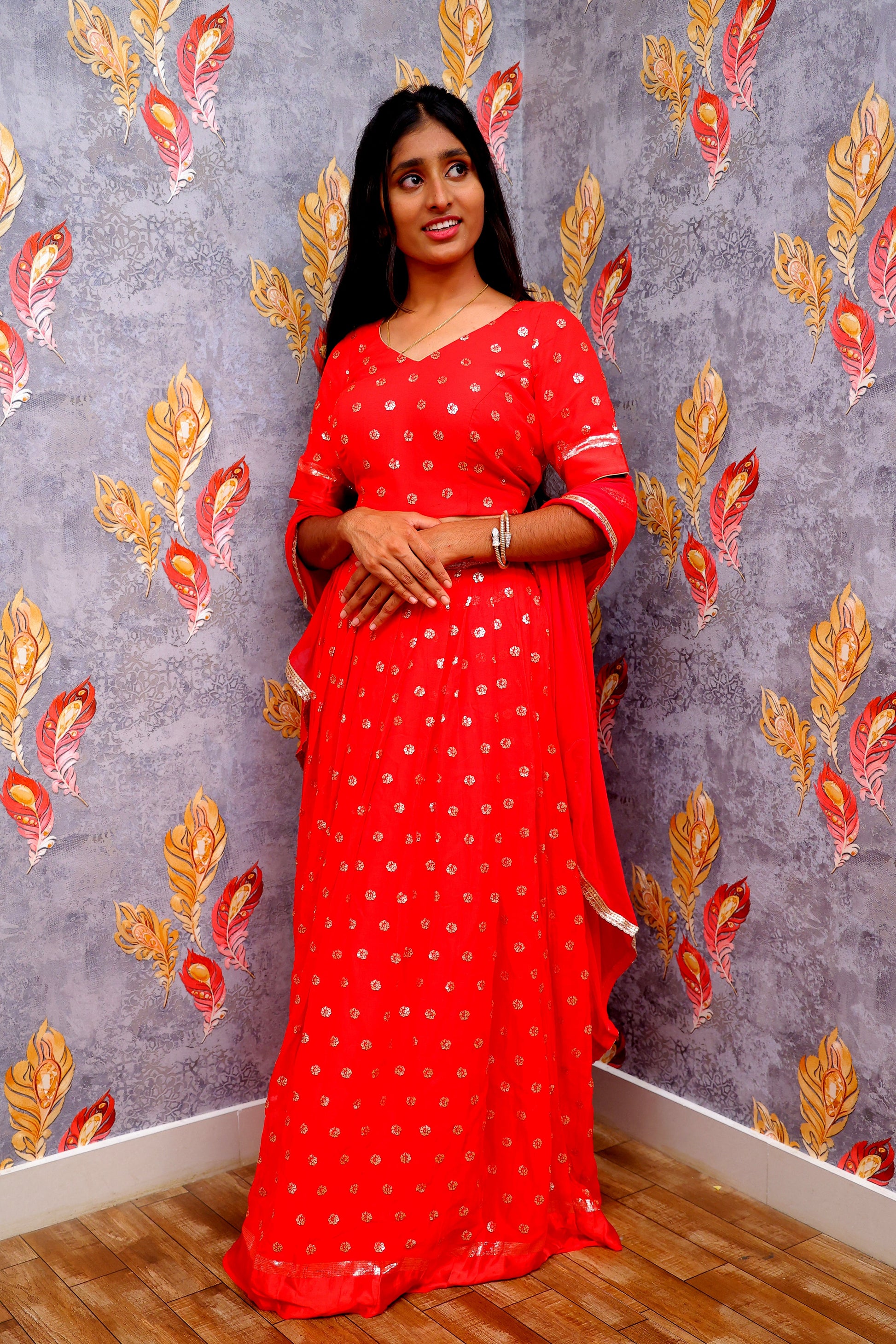 Vibrant Red Small, Scattered Gold-Colored Embellishments Lehenga For Women & Girls