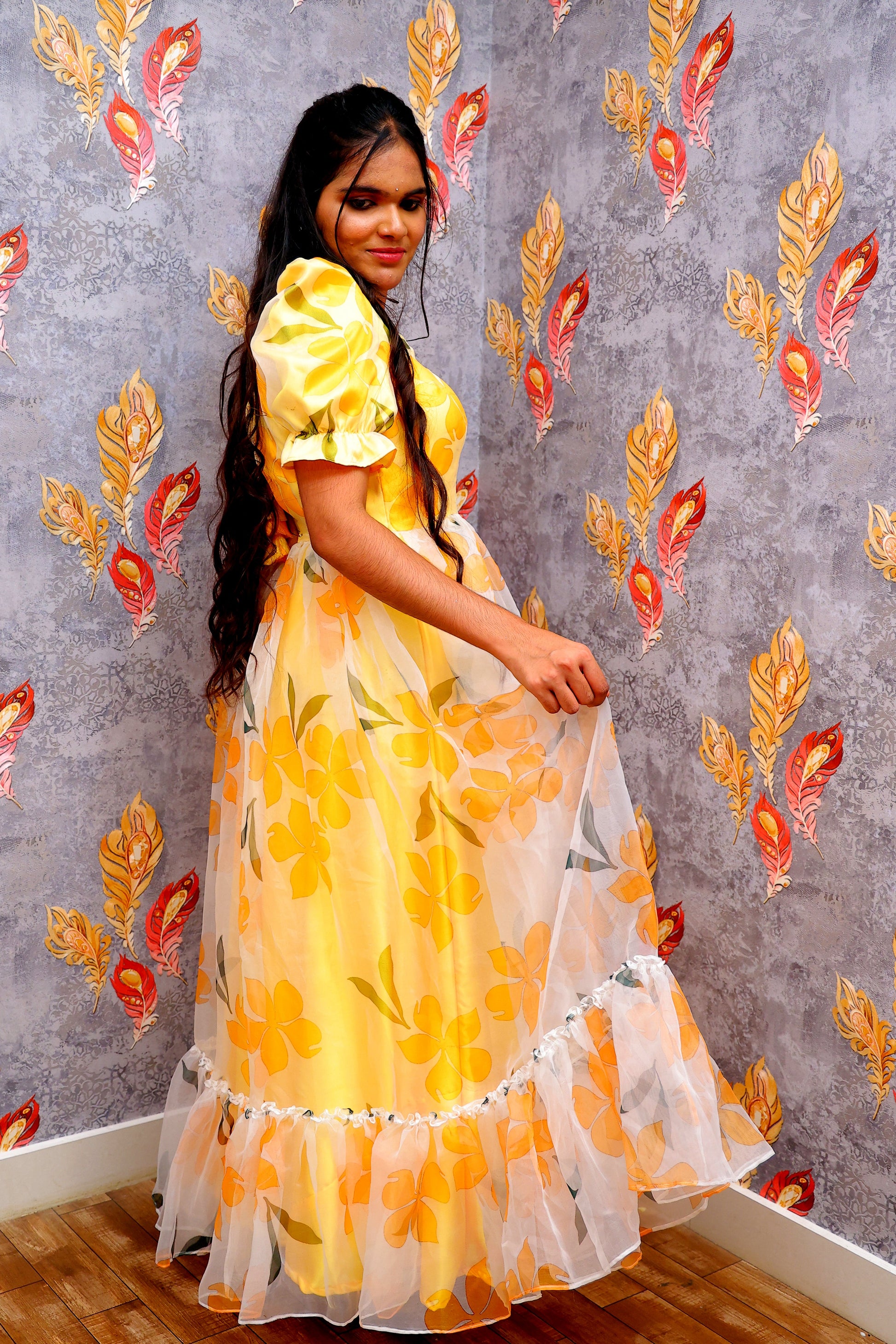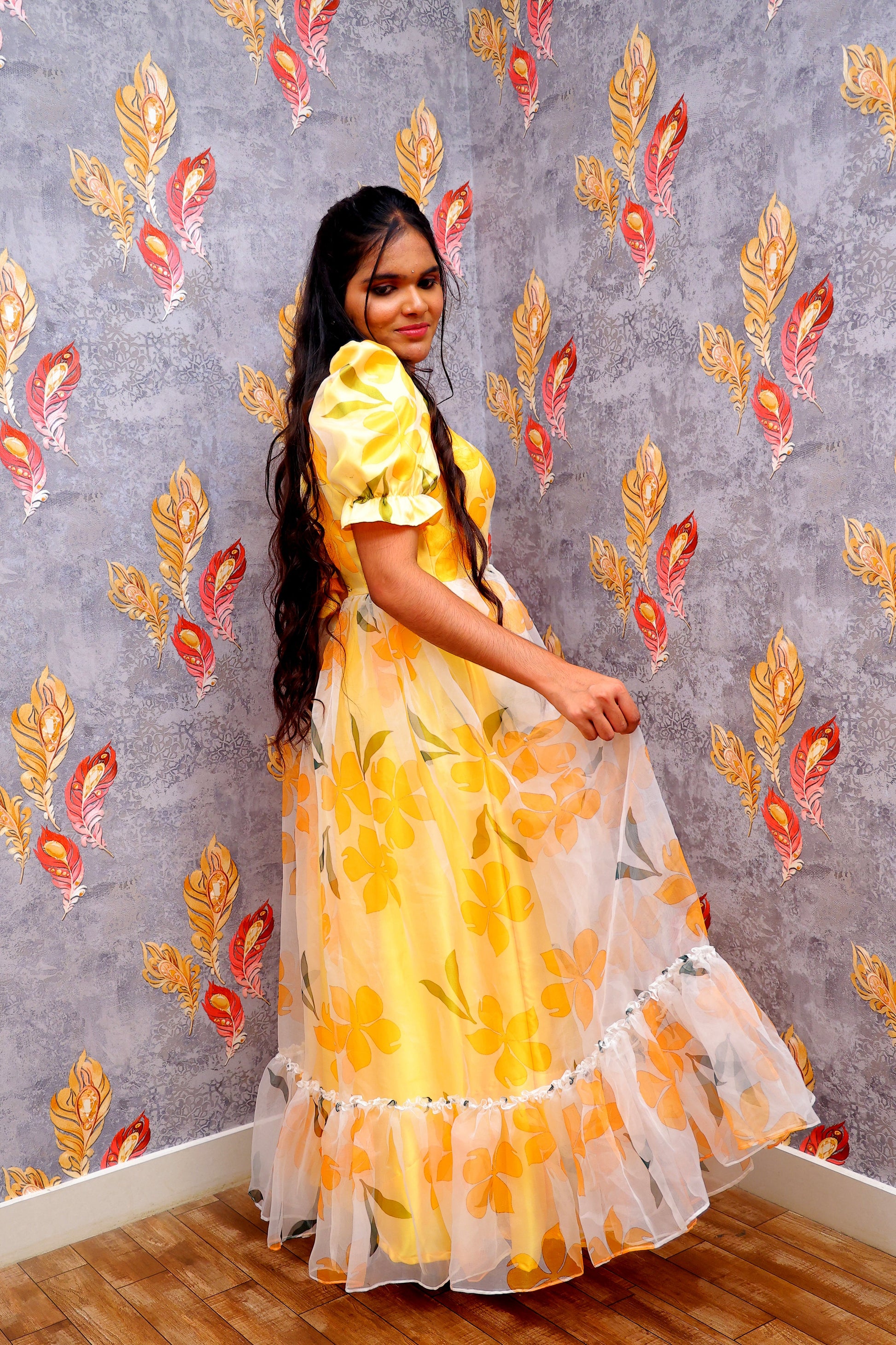Yellow Maxi Gown With A Floral Design For Women & Girls