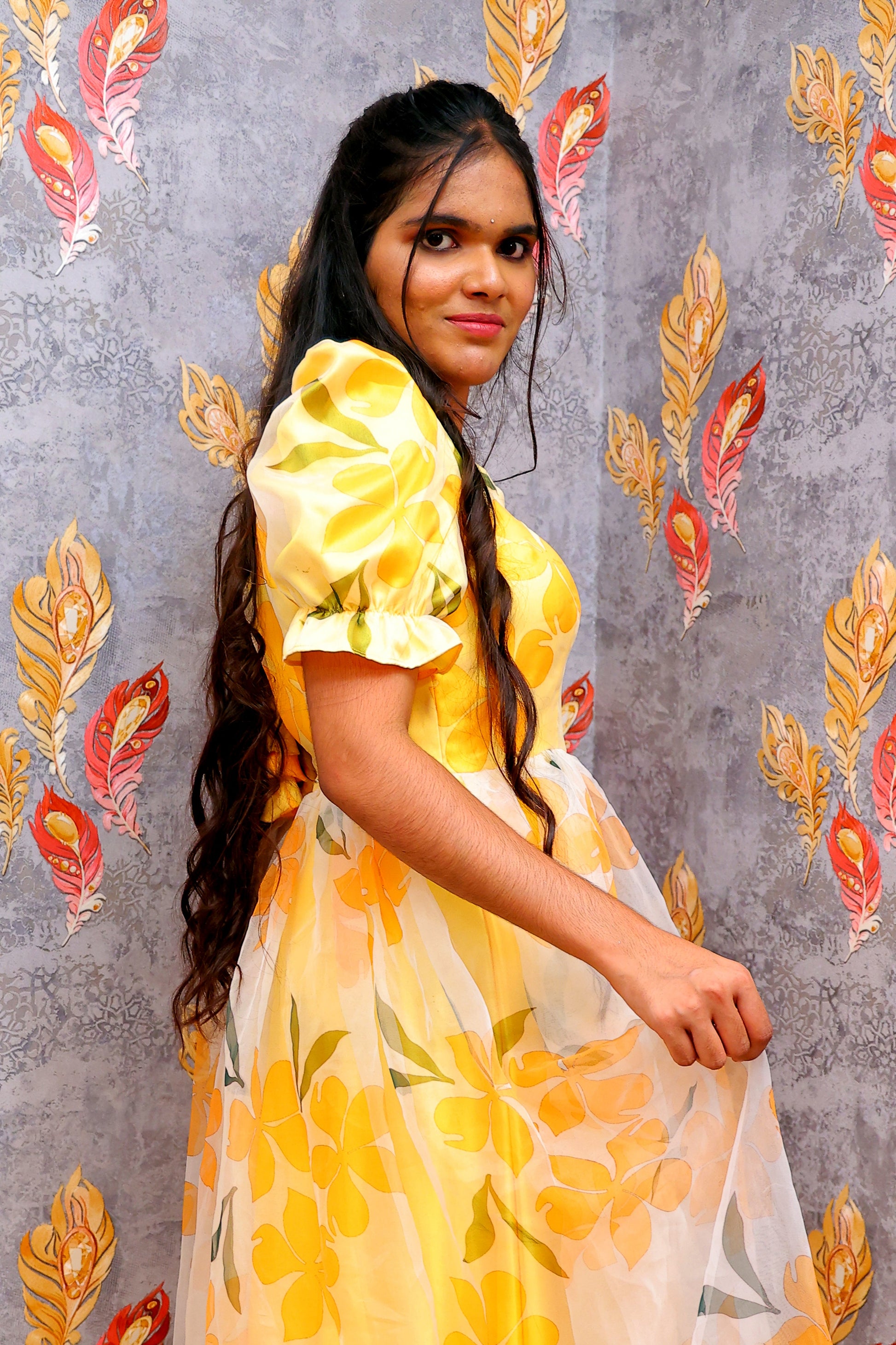 Celebrate effortless femininity with this enchanting sunshine yellow maxi dress from Aira Fabrics Designer Studio, designed to capture the romance of blooming gardens. Crafted in airy organza, the dress features a soft floral print that flows gracefully across the flared silhouette, creating a dreamy and elegant visual appeal.